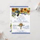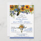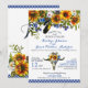 Bohemian floral inspired wedding invitation card design with watercolor longhorn cow skull with feathers, sunflowers, wild flowers and blue gingham check border.