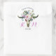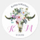Bohemian chic watercolor floral bouquet over longhorn cow skull and white background thank you wedding label.