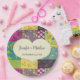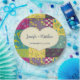 A cream coloured heart shape graphic with faux stitched border is set against a floral patchwork quilt background on this paper plate that has a warm, colourful look and is perfect for boho style weddings. The heart shape is ready to be personalized with the name of the bride and groom and their wedding date.