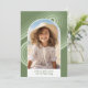 A modern Merry Christmas photo card in shades of pastel gold and green. Curvy retro lines surround the photo in shades of pastel. The front photo is a mod arch with a white border. The back includes 2 more photos. The background for the back is a boho coloured herringbone pattern - an eclectic mix of patterns.