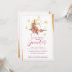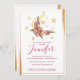 Boho baby shower invitation features moons & stars along with hand-drawn wildflowers in shades of blush pink, peach, and cream, with beautiful gold brush strokes accents. Personalize with your baby shower details in elegant pink lettering accented with handwritten style calligraphy.