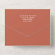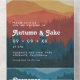 A trendy all-in-one wedding invitation with a retro vibe with white 1970's style font over a digital illustration of mountains and forests in terracotta, navy, mustard yellow and burnt orange.