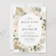 Elegant, tropical floral wedding invitations featuring your names and wedding details at the centre of the design. An oval frame of cream tropical flowers, palm leaves, pampas grass, and green foliage surrounds your wedding information The neutral boho wedding invitations are perfect for your summer beach wedding.