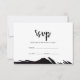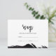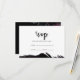 Romantic boho chic wedding rsvp card features feathers and a black background.