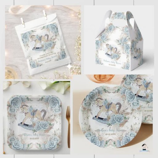 Personalize this boho chic invitation with your own wording easily and quickly, simply press the customize it button to further re-arrange and format the style and placement of the text. Featuring a whimsical wooden rocking horse, pretty baby blue roses and earthy tone pampas grass . Matching items available in store! (c) The Happy Cat Studio.