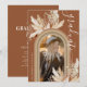 Rustic bohemian graduation party invitations featuring a terracotta background with a rainbow arch feature, a photo of the graduate, watercolor desert dried palm leaves, pampas grass, and a elegant text template that is easy to personalize.