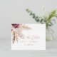This boho pampas grass rose gold foil save the date foil invitation postcard is perfect for a summer wedding. The floral watercolor design features bohemian burgundy and blush pink flowers with sprigs of neutral pampas grass and golden dried palm leaves with luxurious pressed rose gold foil text on the front.