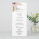 Ce programme de mariage d'herbe à la pampa de sauce boho est parfait pour un mariage d'été. L'aquarelle fleurie présente des fleurs bohèmes bordeaux et roses rousses avec des sprigs de pampa neutres et des feuilles de palmiers séchés dorés. Inclure le nom de la mariée et du marié, la date et le lieu du mariage, le message de remerciement, l'ordre de service, la fête de la mariée et un mémorial optionnel "en mémoire d'amour".