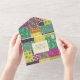 A heart shape graphic is set against a maximalist style floral patchwork quilt background on this all in one wedding invitation with detachable rsvp card that has a warm, colourful look. This invite is easy to customize with all of your event details.
