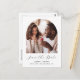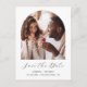 This simple, minimalist boho Save the Date postcard features an arch-shaped photo above the words "Save the Date" in elegant black handwriting script, followed by the couple's names, wedding date and city in sans serif font on a white background. Add your return address and additional details on the back, along with a QR code to help guests visit your wedding website.