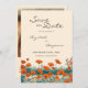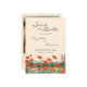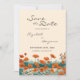 This Beautiful Boho Bohemian Photo save the date card, features an ink drawing of poppies wildflowers with rustic warm colours, orange and teal, inspired in traditional Japanese art technique ukiyo-e or Japanese wood block prints. Personalize this beautiful Save the date card with your own text, photo and QR code.