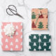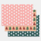 Three different designs of trendy boho pink, green, red and white Christmas trees on these wrapping paper sheets.