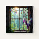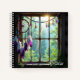 Personalized notebook. A rustic window with a purple feathered dreamcatcher hanging in the window along with colourful sparkly crystals. The window overlooks a beautiful array of trees and sunbeams shining through.