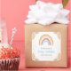 This cute and whimsical baby shower bookplate features a boho rainbow, confetti and floral arrangements with pampas grass in beige, blue and brown neutral tones. The text combines handwritten script and sans serif fonts for a stylish and modern look. This is perfect for a spring or summer baby shower.