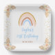 This cute and whimsical plate features a boho rainbow, confetti and floral arrangements with pampas grass in beige, blue and brown neutral tones. The text combines handwritten script and sans serif fonts for a stylish and modern look. This is perfect for a spring or summer baby shower.