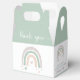Boho baby shower favour box featuring "thank you" in a stylish white script with swashes and a cute abstract watercolor of a sage green, orange and lavender rainbow with hearts. Personalize with the mother-to-be's name and shower date.
