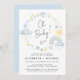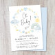 Whimsical boho baby boy couples shower invitation featuring blue and yellow watercolors of a rainbow, sun, hearts, stars, moons and clouds, "Oh Baby!" in a stylish script and the names of the mother and father and the shower details in simple modern typography.