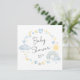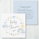 Whimsical boho square baby boy shower invitation featuring pastel blue and yellow watercolors of a rainbow, sun, hearts, stars, moons and clouds.