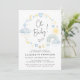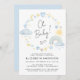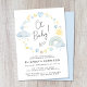 Boho baby boy sprinkle invitation featuring blue and yellow watercolors of a rainbow, sun, hearts, stars, moons and clouds, "Oh Baby!" in a stylish script and the mother-to-be's name and shower details in simple typography.