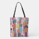This tote bag has a boho modern design of rectangles attached to vertical lines in various sizes and retro colours.