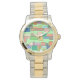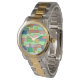 This watch has a boho modern design of rectangles attached to horizontal lines in various sizes and boho colors.