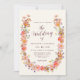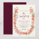 Designed with original artwork by artist Catherine Sweetman, this unique wedding invitation showcases a beautifully detailed dried flower wreath in warm, earthy hues burnt orange, terracotta, burnt umber, coral, peach, brown, yellow, green, purple, and soft pink. The burgundy background adds a deep, romantic tone, while the burnt orange script enhances the natural, autumnal aesthetic.