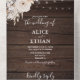 Boho rustic wedding invitation features neutral flowers and string lights on a wood background.