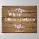 Elegant typography and boho feather flowers with timber slats textures. Customizable wedding sign. Welcome to the wedding of sign poster.
