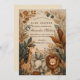 Welcome guests to a warm and whimsical celebration with this Safari-themed baby shower design. Featuring a sweet trio of jungle friends — a giraffe, elephant, and lion — framed by rich boho foliage, earthy neutrals, and soft natural textures.