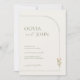 This invitation beautifully blends minimalist elegance with a warm bohemian vibe. The back features an arch-shaped Details slot with QR for you to add you own QR Code, reception, accommodation and RSVP details., set against a calming sage green background with delicate white line-art arches.