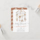 Modern and cute Boho Baby Shower invitations. Great Scandinavian feel with rainbows, pompoms, clouds and stars all hanging on a mobile. Neutral colour scheme for a boy or girl baby to be. Terra cotta, dusty blue grey and white.