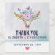 A personalized wedding wine bottle label with a turquoise and pastel watercolor background. A boho chic animal skull with a floral bouquet upon its head and little butterflies fluttering about. A cute decorative border with little teardrop shapes in light blue.