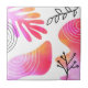 Boho style minimal ceramic tile features black and white lines arch shape, orange and pink blob shape and leave line art.