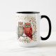 On this unique mug, two owls with boho style patterns perch together on a tree branch. One owl is green and gold; the second owl is red/orange and gold. They are surrounded by gold and green autumn leaves. The image is printed twice on the mug.