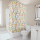This is a pretty spring, summer, and autumn shower curtain with a boho style wildflower pattern in colours of blue, gold, peach, and purple brown. The colourful pattern is placed on a white background. A white circle banner lined in matching brown and blue with your monogram at the centre gives it a personal touch.