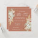 "BOHO Terra Cotta Orchid Floral Pampas Palm Foliage Invitation ." Created from hand painted watercolor golden dried palm fronds, muted white orchids blush pink pampas grass and pink roses. The background is in a terracotta, rust toned colour that can be changed. Created by internationally licensed artist and designer, Audrey Jeanne Roberts, copyright all rights reserved.
