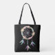 Boho Tote Bag in black with dream catcher image. Dream catcher tote bag in black. Here is a pretty bag to catch all your dreams! Black tote bag with pastel pinks, mints and purple coloured floral dream catcher printed on both front and back of bag.