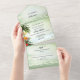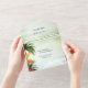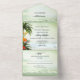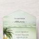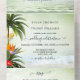Boho élégant tout en une faire-part de mariage larvée avec un design tropical côtier avec palmiers, lanternes festives et fleurs colorées donnant sur une plage pétillante et vert pâle