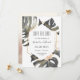 A beautifully tropical boho stylish wedding Save the Date card with your lush tropical watercolor botanicals that includes beige-peach orchids and sweetheart roses with Monstera leaf foliage. A geometric gold edged frame surrounds your text in modern style. Personalize the text template with your wedding details.