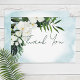 This wedding thank you card design features beautiful, lush tropic greenery and white florals on a soft Caribbean aqua blue watercolor background. Perfect for the destination or beach wedding. Use the included message or change it to add your own. Created by Simply Farmhouse Press.