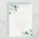 Invite guests to your event with this gold foil pressed wedding invitation. It features watercolor illustration of eucalyptus leaves and blossoms. This watercolor eucalyptus wedding invitation is perfect for spring weddings, winter weddings and boho weddings. Personalize this greenery wedding invitation by adding your wedding details. This gold foil wedding invitation is available in other foil finishes.