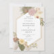 This invitation has bohemian inspired watercolor features, including pampas grass, orchids, palm leaves, anthurium and protea flowers in a neutral palette. It has a white hexagon with a simulated gold frame. The background behind the shape can be changed, or deleted if you want white. The copy is editable and the font can be changed. The card has a coloured background, a little darker than the front. You can change the back colour.