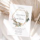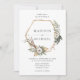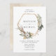 Elegant, unique floral wedding invitation featuring your names inside of a faux gold foil geometric frame adorned with white watercolor flowers and lush foliage in rich green, beige, and brown earth tones. Personalize the floral invitations by adding details such as wedding date, time, venue, and reception information. The invite reverses to a light beige watercolor background.