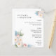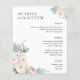 Elegant botanical chic wedding menu with floral accent at the corners featuring your names in elegant serif bold and a bouquet of white blue and pink roses and peonies in soft watercolors. Personalize with your wedding dinner details beneath.
