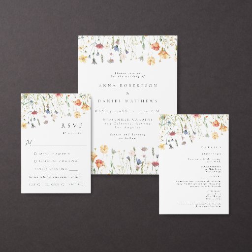 This design features a border of elegant watercolor flowers. Perfect for rustic, boho spring and summer weddings.