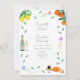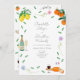 Beautiful whimsical french boho cheese and wine themed modern colourful watercolor wedding engagement invitation with simple botanicals, orange and lemon citrus theme ideal for a sunny summer European themed wedding engagement party. Original artwork by artist Catherine Sweetman includes foliage, wildflowers, french cheese and wine, the french flag, musical notes and wine flutes of sparkling bubbly wine. Whimsical handwriting and modern typography script with easy to personalize templates to add names, the date and other essential information along with the bride and grooms initials on the sparkling wine bottle label illustration. Colour palette includes lemon, yellow, orange, green, blue, purple and pink.