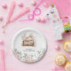 Boho Woodland Animals & Floral Baby Shower Plate. Design features autumn vibes with the cutest little mouse asleep on a rustic wooden tree stump, decorated with pink watercolor florals and greenery.