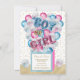 Sur une parties scintillant d'or confetti arrière - plan, des ballons de confetti bleu et rose entourent des ballons de lettres bleu et rose qui lisent garçon ou fille. Les ballons sortent d'une boîte de surprise de ballons qui est adressée aux parents d'être, pour ouvrir avec leur famille et leurs amis. Personnalisez en ajoutant vos détails uniques à l'avant et à l'arrière.