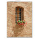 Une vieille fenêtre arquée a placé dans un vieux mur de briques avec les fleurs rouges ornant la boîte de fenêtre