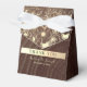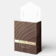 Elégante boîte de faveur de mariage rustique avec une texture imitation bois, des lumières à cordes et des détails floraux en or. Personnalisé avec les noms et la date, il est parfait pour l'emballage de douceurs, petits cadeaux ou notes de remerciement pour vos invités.